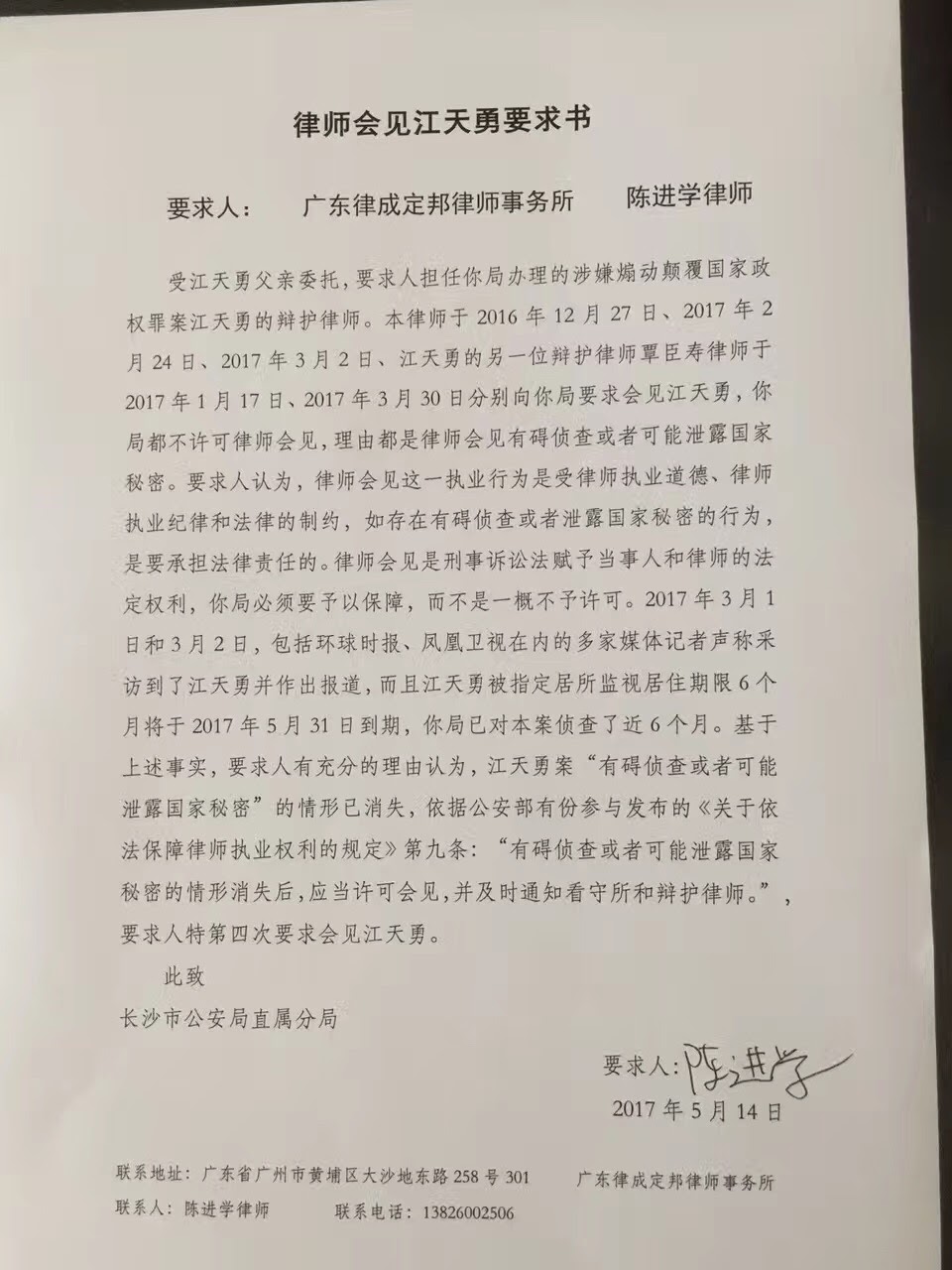 2015年5月14日,被涉嫌煽动颠覆国家政权罪执行指定监视居住的江天勇,其辩护律师陈进学向长沙市公安局直属分局发文,第四次要求会见江天勇。