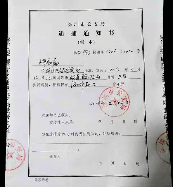 2017年5月13日,深圳大抓捕事件中王军的指定居所监视居住期限届满后,其家属收到深圳市公安局逮捕通知书,王军遭深圳市人民检察院以涉嫌颠覆国家政权罪执行逮捕,现羁押于深圳市第二看守所。深公(预)捕通字[2107]1012号