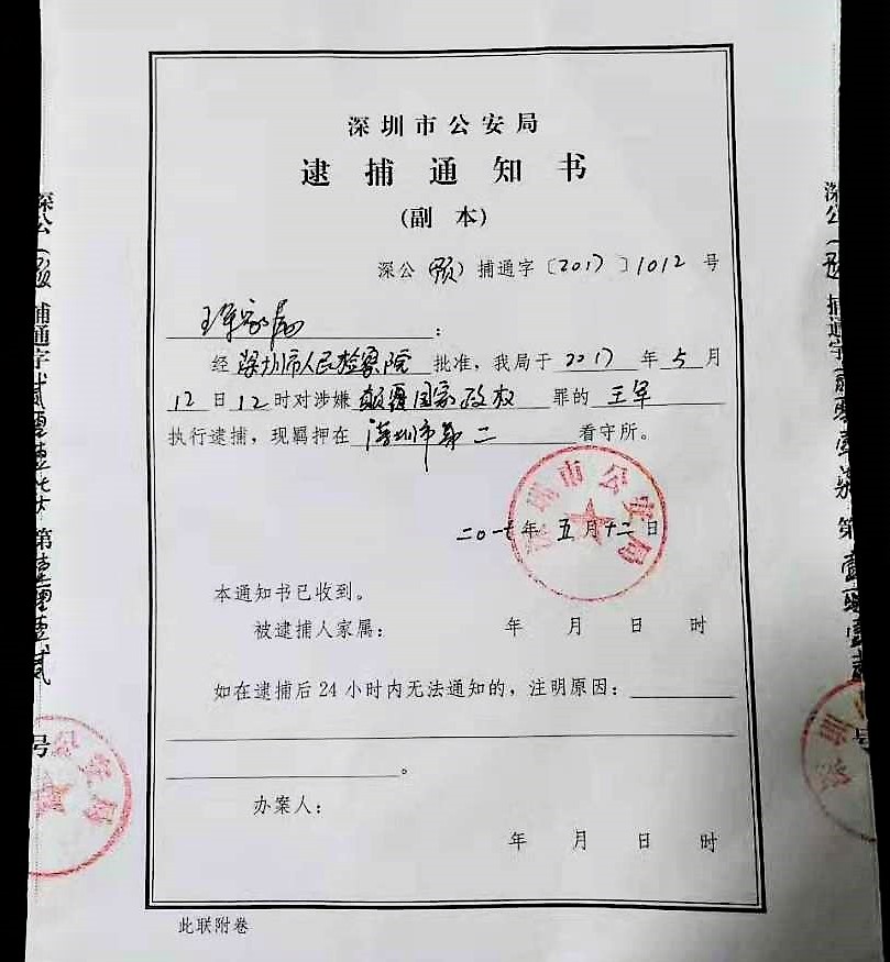 2017年5月13日,深圳大抓捕事件中王军的指定居所监视居住期限届满后,其家属收到深圳市公安局逮捕通知书,王军遭深圳市人民检察院以涉嫌颠覆国家政权罪执行逮捕,现羁押于深圳市第二看守所。深公(预)捕通字[2107]1012号