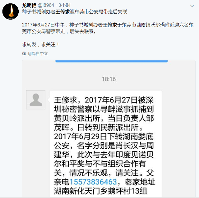 权利运动编辑员获悉,2017年6月27日中午,种子书城创办者王修求于东莞市塘厦镇沃尔玛附近遭六名公安局警察带走,后失去联系,2017年6月29日移交至湖南娄底公安。家属至今未接获任何通知。