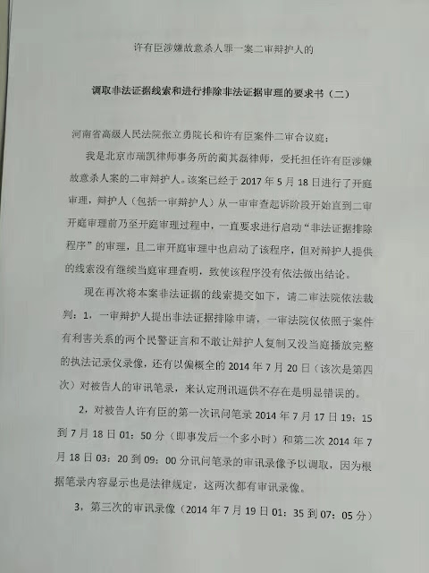 权利运行编辑员获悉,2017年6月20日,涉嫌剌死截访警察而被控故意杀人罪一审遭判处死刑的河南焦作访民许有臣案,其辩护律师蔺其磊向河南省高级人民法院在继续要求复制现场监控录像和执法记录仪的要求下,持续要求二审法院按照法律规定调取辩护人提供的“非法证据排除”线索,将法律规定的“非法证据排除”程序走下去。
