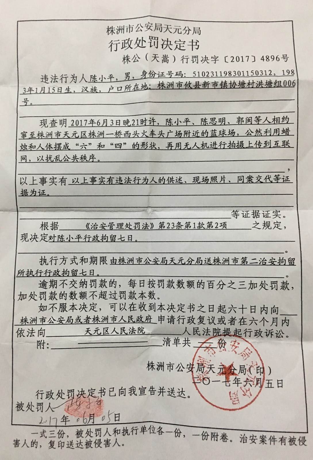 2017年6月3日晚上,湖南株洲公民郭闽、郭胜、陈小平、陈思明、李明、刘镇、孙华柱、文博、唐玉春(女)、唐雪云(女)在天元区湘江风光带附近以人体行为艺术和燃点蜡烛摆出“六”和“四”的形状纪念“六四事件”发生28周年,并用遥控无人机进行航拍,将图片上传至互联网。次日,所有活动参与者相继遭株洲警方传唤带走,随后证实多人被处以行政拘留,其中郭闽和郭胜被拘留十天,陈小平、陈思明、李明、唐雪云被拘留七天,唐玉春被拘留七天但免于执行,另有虽未参与纪念活动但因与陈小平合租住房的吴晓彬和刘振华也受牵连遭警方传唤,被嵩山路派出所控制二十多个小时后获释。