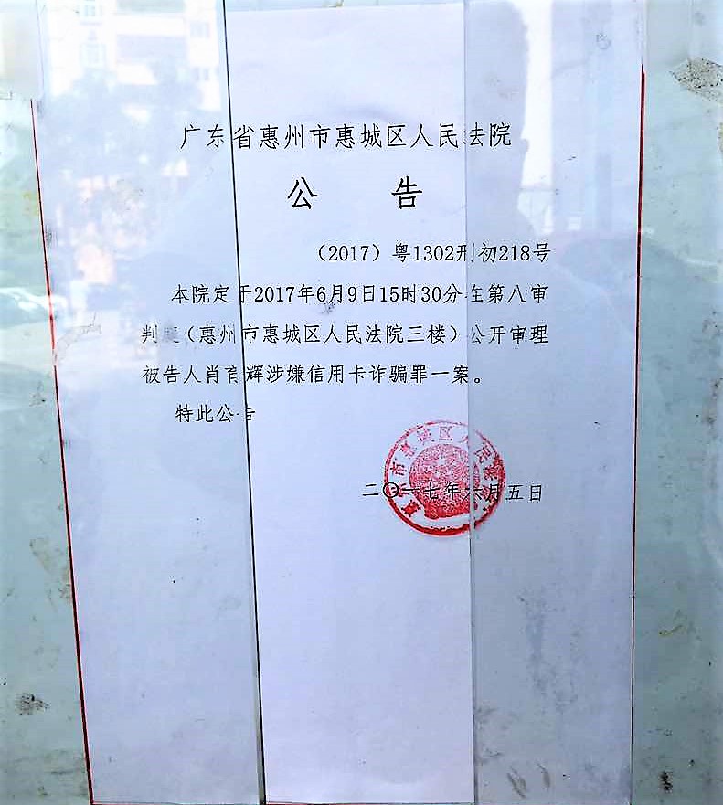 (据广东省惠州市惠城区人民检察院起诉书显示,肖育辉账户欠款已于2016年10月26日结清。惠城公诉刑诉[2017]208号)