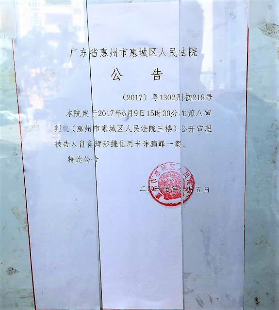 2017年6月9日,涉信用卡欠款一万零五百元遭惠州市公安局逮捕的广东公益维权人士肖育辉案件于6月9日在惠州市惠城区人民法院开庭审理,但家属至今未收到通知。下午法院庭外有数十名警察站岗,杨建平、黄永祥(南方老头)、王家维(维之)、李建晓等多人欲申请旁听遭强行带离,其中黄永祥、王家维等人被强行带至河南岸派出所做笔录。
