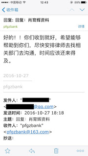10月27日广州浦发银行亦给肖育辉家属邮件提供还款证明,浦发银行亦希望帮忙协助争取释放肖育辉事宜。