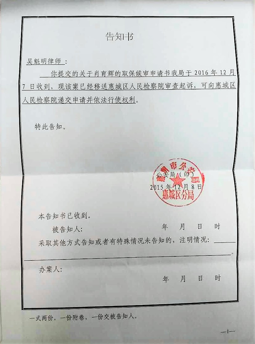 权利运动编辑员获悉,2017年6月6日,吴魁明律师联系惠州惠城区法院落实涉信用卡欠款一万零五百元遭惠州市公安局逮捕的广东公益维权人士肖育辉案开庭情况,却被告知肖育辉已于看守所将其解聘,看守所于周一把该份告知书交给法官。吴魁明律师指,从别的渠道获悉,案件或于12日开庭,暂时没法证实,家属未接到通知。此外,法官透露肖育辉自行聘请律师,估计是官派律师。