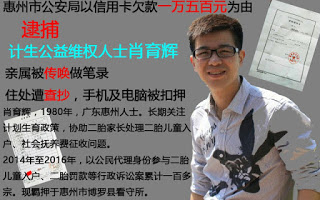 据网上公开信息显示,多年从事计生倡导的广东公益维权人士肖育辉于2016年10月3日在惠州亲戚家中被惠州市城区公安分局国保大队便衣及经济侦查大队刑拘带走。之后,肖的亲属被传唤做笔录,住处遭查抄,数台手机及电脑被扣押。10月8日律师前往惠州市看守所会见到肖育辉,确认惠州市公安局以肖育辉拖欠2014年浦发银行信用卡一万零五百元(及八千多元利息)为由,将其刑拘。10月12日转为逮捕,10月24日700多名二胎家长发起借款为其还款。10月27日,广州浦发银行亦给肖育辉家属邮件提供还款证明,浦发银行亦希望帮忙协助争取释放肖育辉事宜,但目前当事人仍然被羁押于惠州市博罗县看守所。