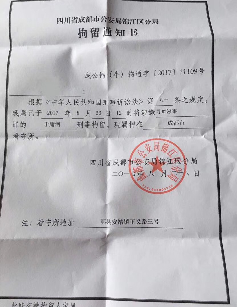 次日下午,于庸河的妻子从警方处拿到一份拘留通知书,得知于庸河被涉嫌寻衅滋事遭刑事拘留,羁押在成都市看守所。据熟悉于庸河的人士透露,于庸河现年47岁,是一位注册会计师,为人谦和理性,急公好义,喜欢读书。