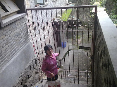 (林秀英、吴华英、魏英、黄财漂、林兰英、卓友桂在闽清县医院)(林秀英手指的地方正是停放其女儿严晓玲尸体的停尸房)