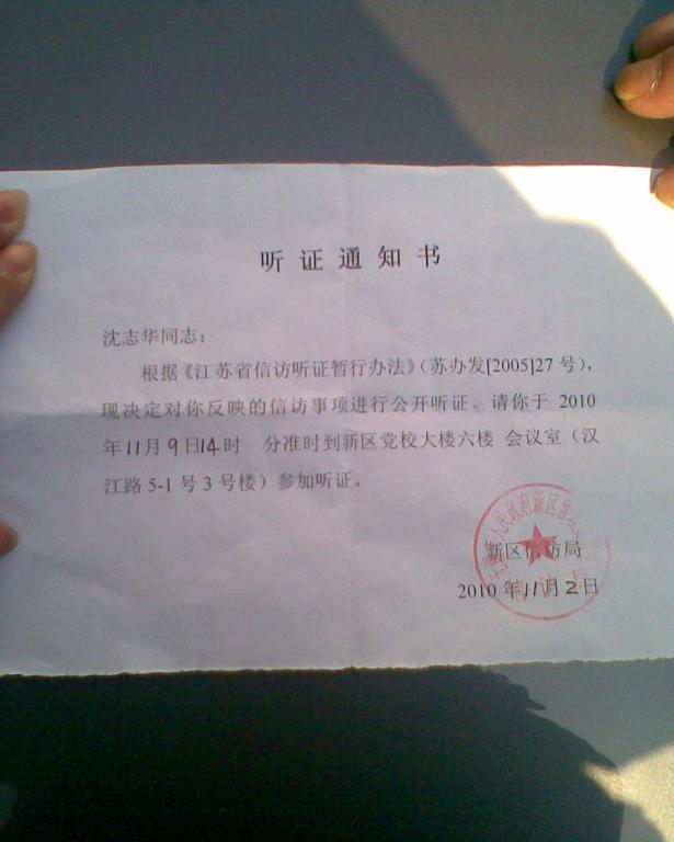 江苏无锡新区旺庄镇荆同村周甲里沈志华,在经历房屋遭当局非法强拆七年、上访七年、非法关押黑牢合计282天后,终于争取到了七年前政府对自己房屋强拆合法性的公开听证会。