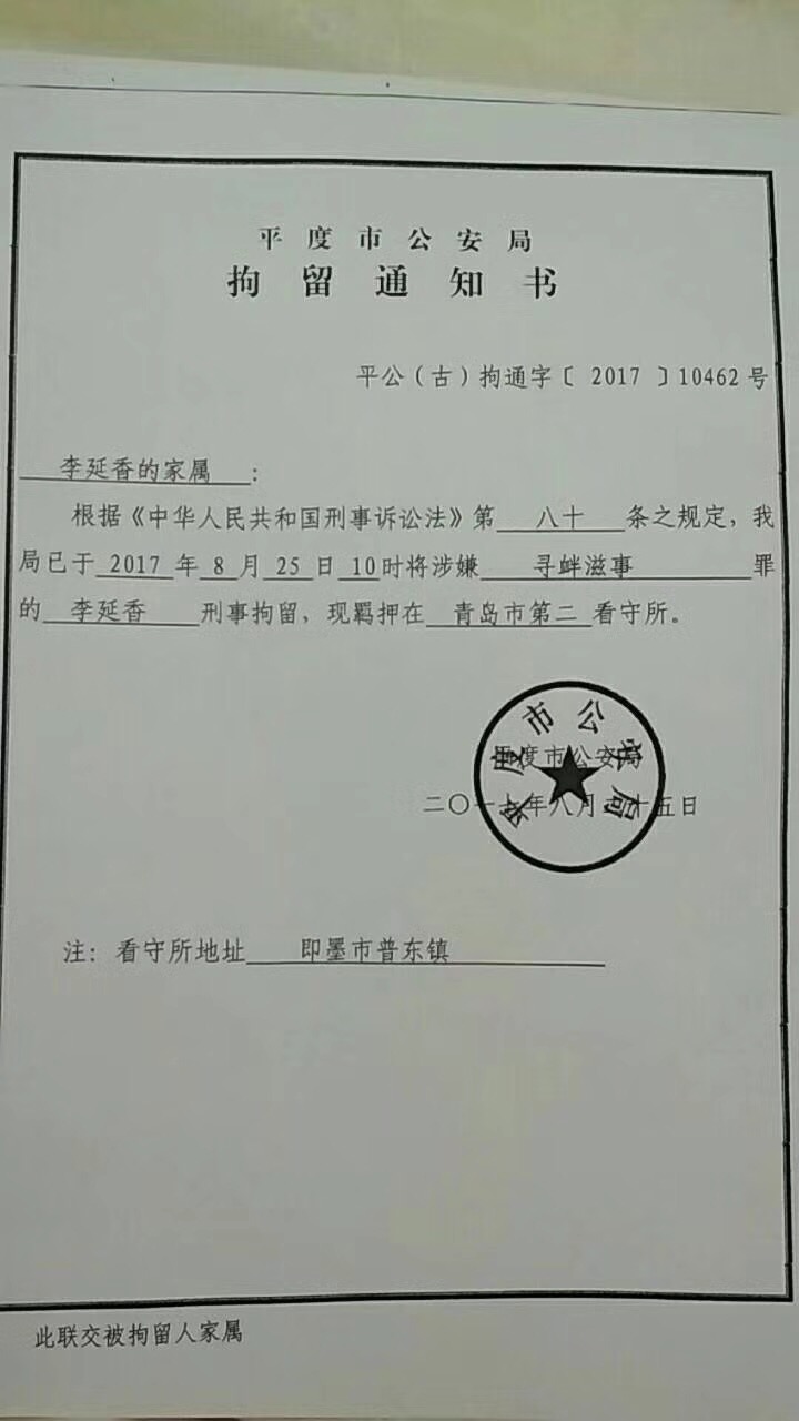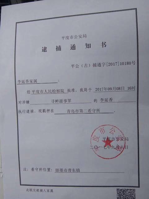 2017年8月17号,李延香坐车路过天安门,被北京警察查身份证,被扣押,后被山东青岛维稳人员连夜接回青岛拘留十天,2017年8月25号当局以“寻衅滋事罪”转刑事拘留,2017年9月8号以寻衅滋事罪执行逮捕。