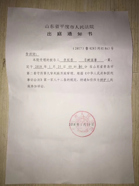 权利运动编辑员获悉,2018年1月19日,遭山东青岛平度市警方以寻衅滋事罪逮捕的山东维权人士李延香案将于2018年1月25日9点30分在青岛市第二看守所第九审判庭公开开庭审理。