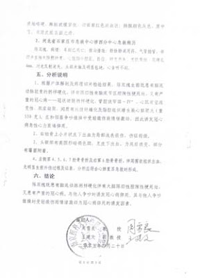 上海司法鉴定中心的结果不可信,因他们鉴定书中的“肋骨骨折处周围软组织未见出血(二检时我们家属在骨折的胸腔内侧看到了大面积出血,南京法医才两次来石证明了五根肋骨骨折)或仅有轻度出血符合死后伤或濒死期损伤”等话自相矛盾,把皮肤紫绀变成口唇紫绀与事实不符,我们多次申请对断骨处做化验及心尖部的伤做补充鉴定【区政法委副书记崔力(当时的工资关系在新华分局,现任新华区城管局局长)和区稳定办张秀中主任,删去了我们鉴定申请书中对断骨处做化验及心尖部之伤鉴定一节】,为什么没有结果?我们申请做补充鉴定,用现代科学的办法证明却得不到答复。因此他们的鉴定已没有可信度。