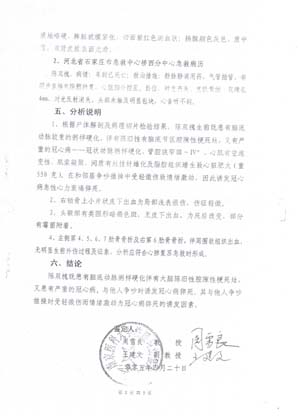 通过二次尸检证明,一检报告中所说的“右锁骨下有0.7*0.2厘米的皮下出血”之伤的实际位置是在锁骨上,伤的实际面积要大得多。南京法医当时解释“实际位置(锁骨上)是不能做穿刺的”,并证明属于外伤。在我父亲头部被石棉瓦砸到的位置上,一检报告中写“未见任何症状”的地方,有明显的生理改变;一检报告中写未见胸腔内有积血积液,而实际是二次尸检时我们看到胸腔内侧有大面积的出血;我们走访有关专家之后,才又二次请南京法医来石作补充鉴定,(南医鉴[2005]病字5号)证明我父亲前胸左侧第4,5,6,7根,右侧第6根肋骨骨折并伴有出血,而此伤一检报告一字未提;最重要的是一检报告证明我父亲胸骨左缘有针刺孔(二检证明在相应部位的心尖部有针刺伤),证明是120打强心针所留。因120没有打强心针,这伤是怎么造成的?公安局长大接访时,我们把以上事实当面反映给三级公安局领导。2005年9月,公安局法医又把胸骨左缘的针刺孔损伤变为“胸骨左缘有针刺孔状表皮损伤(多了五个字)”,证明是电除颤时高压电产生的电火花造成的,真是天大的谎言!我们走访咨询有关专家及120医生多人,都证明电除颤心脏复苏时,绝不会产生电火花,更不会伤及病人,尚120买的是假冒伪劣产品或许可能出现电火花,它也只能灼伤皮肤,只有激光、α、β、γ射线才能通过胸腔伤及心脏。世界上还没有生产出这种致人死地的起博器。所以市公安局法医做出的结论,纯属胡诌。明显是隐瞒伤情,包庇黑恶势力杀人团伙。