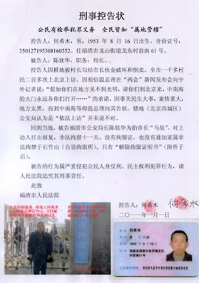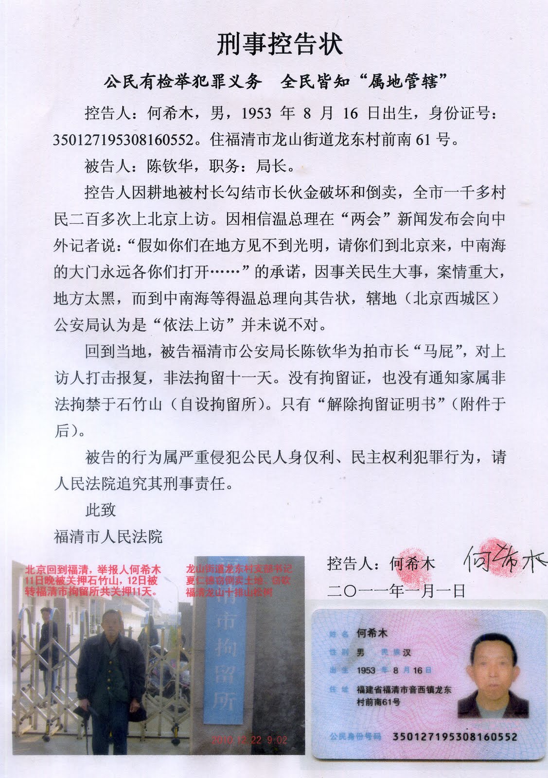 福建失地农民何希木状告公安局长 2011-01-11 权利运动编辑 (2011-1-11)权利运动发布:新年伊始,福建省福清市龙山街道龙东村失地农民何希木向法院提交诉状,状告福清市公安局长陈钦华为非法征地保驾护航,打压失地农民上访维权。 公安局长被告,一方面说明民众的维权意识、法治意识、正在加强,民主意识人权观念正在觉醒,另一方面说明维稳也将公安机关变成了一个不伦不类的机构。 相信,随着民众的觉醒,更多拒绝遵守《警察法》的公安局长将被送上被告席。(闻天不祥撰稿) 分享这篇文章到: