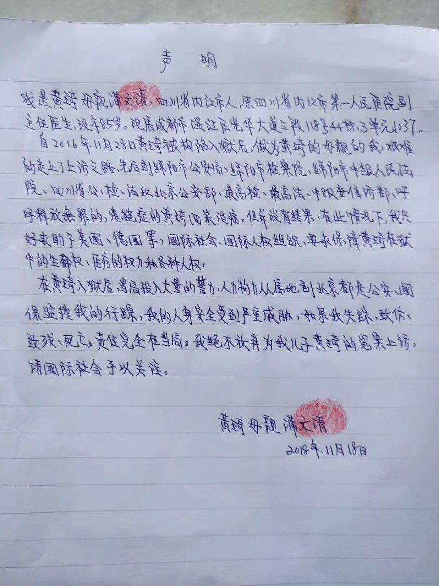 (四川-2018年11月19日)六四天网创办人黄琦关押近两年,在看守所病情严重,其年迈母亲为儿到处申诉,被监控跟踪。近日她发声明指人身安全受威胁,希望国际社会关注。