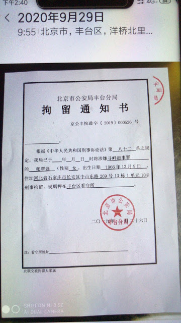 (维权网信息中心报道)2020年10月6日,本网获悉:2020年9月28日的“双节”前,河北省石家庄市长安区的维权访民张翠磊,经过长达一年多的不懈努力,终于从北京市公安局丰台区分局拿到了2019年4月20日无端被刑事拘留的通知书,该拘留通知书不仅没有送达家属,而且落款的日期居然是2019年的2月26日。