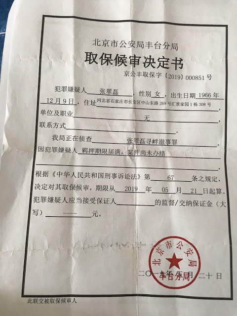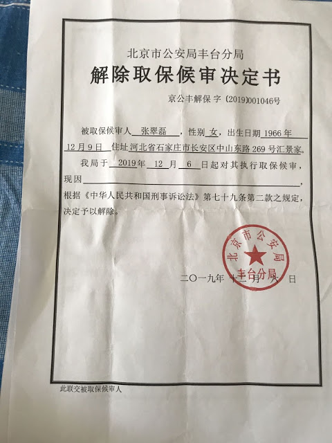 获得自由的张翠磊百思不得其解,自己经朋友介绍去打工,怎么就涉嫌寻衅滋事罪了?为此,张翠磊就象当年的杨佳那样,每周都会到丰台分局洋桥派出所要说法,尤其是刑事拘留通知书、取保候审决定书、及解除取保候审决定书,在遭到拒绝后一次次给北京市市长热线打电话,直到2020年7月21日拿到取保候审决定书与解除取保候审决定书,其实在2019年12月6日早就解除取保候审了,直到今年的“双节”前夕,才拿到本应该在去年4月20日就向家属送达的拘留通知书。