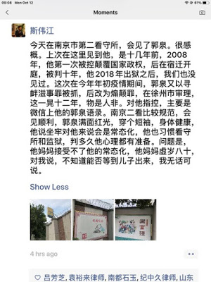 斯伟江律师通报说:2020年10月12日在南京市第二看守所,会见郭泉。上次在这里见到他是十几年前,2008年他被控颠覆国家政权,被判十年,2018年出狱。这次在年初疫情期间被抓,以煽动颠覆国家政权罪在徐州市法院审理。对他指控,主要是微信上他的郭泉语录。郭泉满面红光,穿个短袖,身体健康。郭泉声言不惧坐牢。