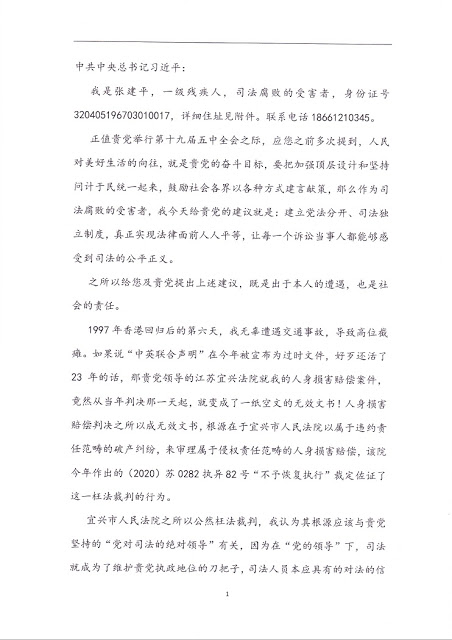 (维权网信息中心报道)2020年10月26日,本网获悉:正值中共中央十九届五中全会举行之际,江苏维权人士、司法腐败的受害者张建平,应之前中共中央总书记习近平多次“要把加强顶层设计和坚持问计于民统一起来,鼓励社会各界以各种方式建言献策”的表态,以公开信的方式提出建议:建立党法分开、司法独立制度,改变民众“信访不信法”现状!