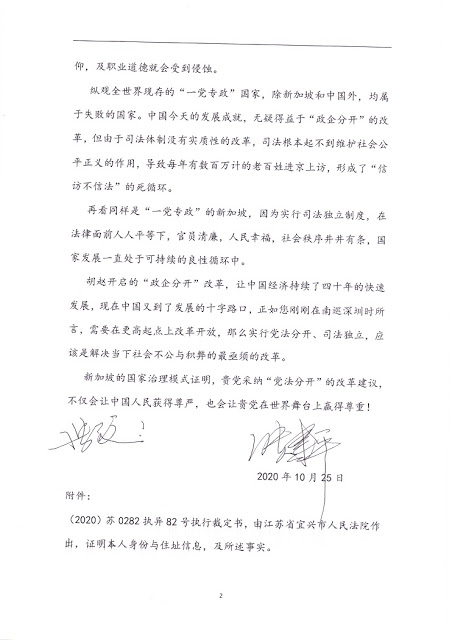 在给中共中央总书记习近平的建议信中,张建平先生以同样是一党专政的新加坡做对比,证明只要实行党法分开、司法独立的制度,一党专政的国家照样能有民主国家所体现的司法是社会公平正义的最有效防线。