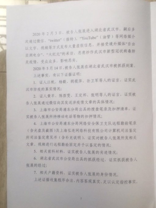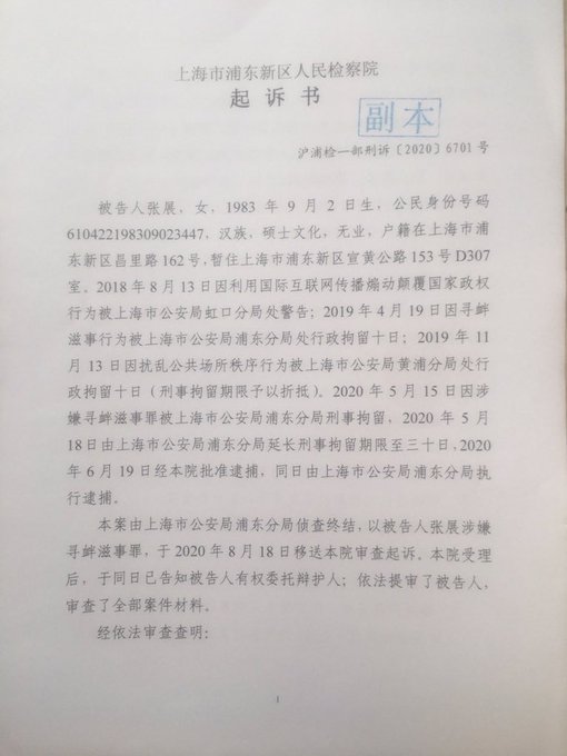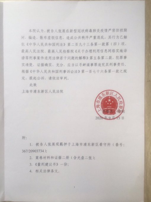 公民记者/人权捍卫者张展的起诉书 2020-11-13 权利运动编辑 本文转载自:http://wqw2010.blogspot.com/2020/11/blog-post_24.html 分享这篇文章到: