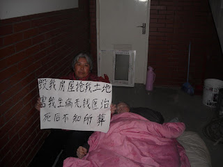(看一对中国老人遭地产党掠夺后的惨状)(今年68岁的老人沈通海经不起房屋被强拆、儿子被判刑、老伴被暴力、儿媳妇被关黑监狱等等折磨,终罹患上了癌症,流离失所又无钱医治的程婉君只能将老伴沈通海送到太湖街道湖东村委,而村支书“王无德”早已躲避在外)