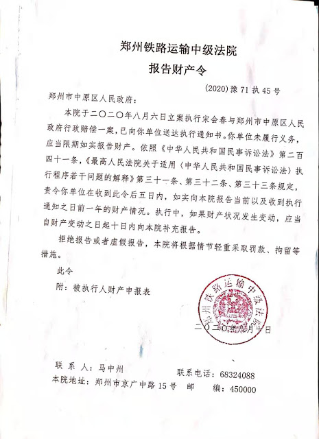 (维权网信息中心报道)2020年11月20日,本网获悉:2020年11月19日上午九点30分,宋会春按照郑州铁路运输中级法院信访办的指示,赶到该院立案大厅。宋会春因郑州中原区政府败诉后未履行法院判决赔偿的义务,连续四次向郑州铁路运输中级法院信访办反映中原区政府履行赔偿不到位的情况,并提交《廉政监督卡》,请求法院对中原区政府负责人采取必要的强制措施。