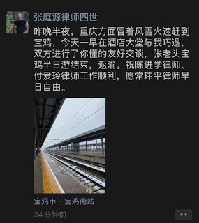 宝鸡维权人士龙克海通报说:“昨天是常玮平律师第二次指定居所监视居住满一个月的日子,张庭源律师、付爱玲律师、陈进学律师受家属委托前往宝鸡办案,一上高铁,张庭源律师就接到当地司法局的电话。今天早上更是被当地司法局连夜赶来的人将张庭源律师堵在酒店强行带走了。宝鸡市高新分局,你们凭什么查询律师的行踪?你们凭什么查律师住哪家酒店?你们凭什么阻挡律师辩护?法律今天早上又给你当了一次厕纸!”