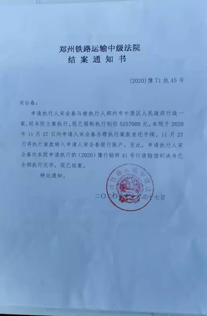 (维权网信息中心报道)2020年11月29日,本网获悉:2020年11月27日,郑州铁路运输中级法院(简称郑铁中院)作出了(2020)豫71执45号《结案通知书》,称“申请人宋会春向本院申请执行的(2020)豫行赔终41号行政赔偿判决书已全部执行完毕,现已结案”。宋会春很纳闷,郑铁中院对郑州市中原区人民政府赔偿款的执行,经历了五个月,至少在2020年11月27日还未执行完毕,且还有迟延履行金分文未执行,为何迫不及待地作出“全部执行完毕,现已结案”的通知?