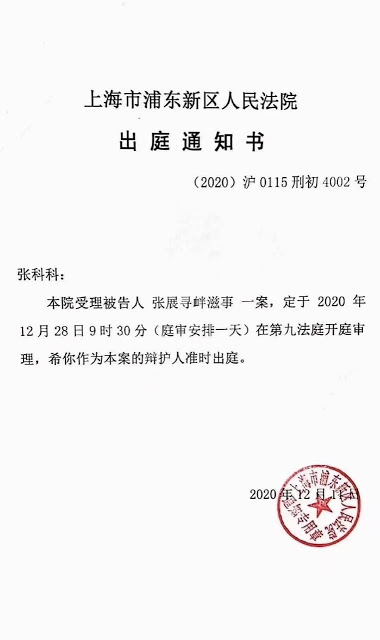 (维权网信息中心报道)2020年12月16日,本网获悉:公民记者张展被控寻衅滋事案将于2020年12月28日9:30在上海浦东新区法院第九法庭开庭审理。