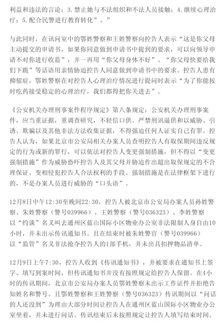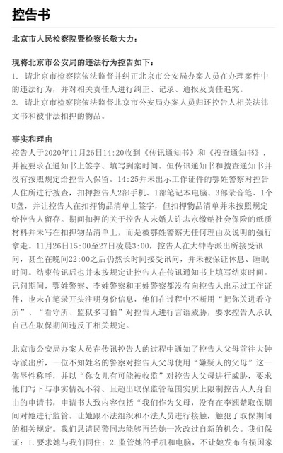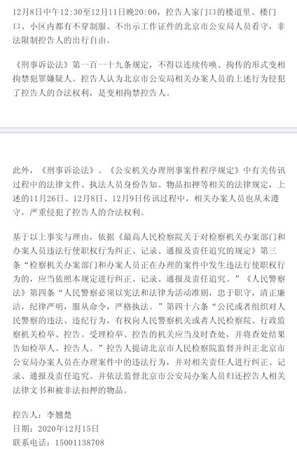 李翘楚说:“2020年11月26日被“公开指监经历就是串供”为由传讯十几个小时。我父母在被威胁后将我“看管”在家中近20天,却亲眼看见12月8日至11日国保以传讯名义在小区物业限制我人身自由。我对北京市公安局一系列违法行为向检察院提出控告。一秒钟的黑暗不会让人变成瞎子。被侵犯的权利决不轻易让渡,沉默不是我的本色。”