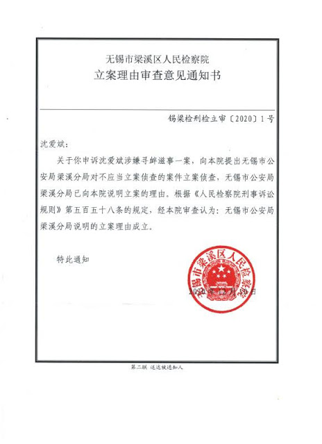 2020年5月20日,沈爱斌向无锡市梁溪区人民检察院提交《立案监督申请书》,请求梁溪检察院依法对梁溪公安分局的违法刑事立案行为进行监督,12月17日,沈爱斌收到了梁溪检察院的《立案理由审查意见通知书》(锡梁检刑检立审【2020】1号),称:经本院审查认为:无锡市公安局梁溪分局说明的立案理由成立。