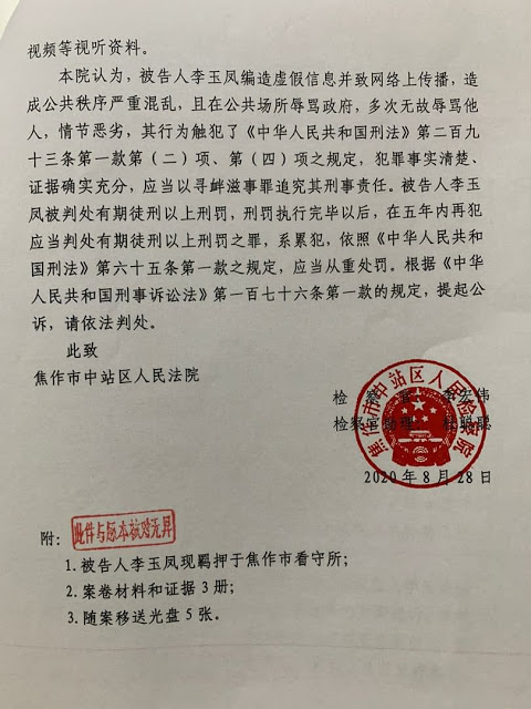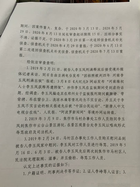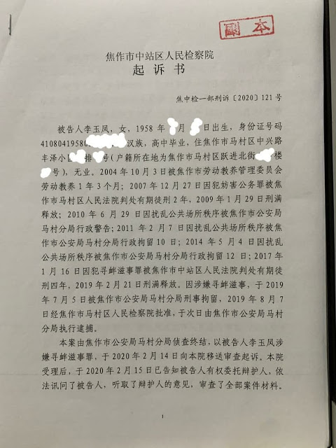 (维权网信息中心报道)2021年1月1日,本网获悉河南维权人士李玉凤女士案情及起诉书,现在通报如下: