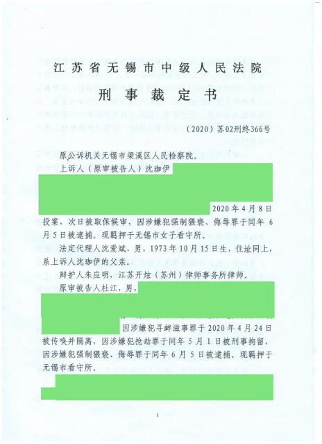2020年11月16日,无锡市梁溪区法院以强制侮辱罪判处沈爱斌17岁女儿沈珈伊二年八个月徒刑,一审案号:(2020)苏0213刑初564号,沈爱斌随即提起上诉,无锡市中级法院于2020年12月31日作出“驳回上诉,维持原判”的终审裁定,案号:(2020)苏02刑终366号。
