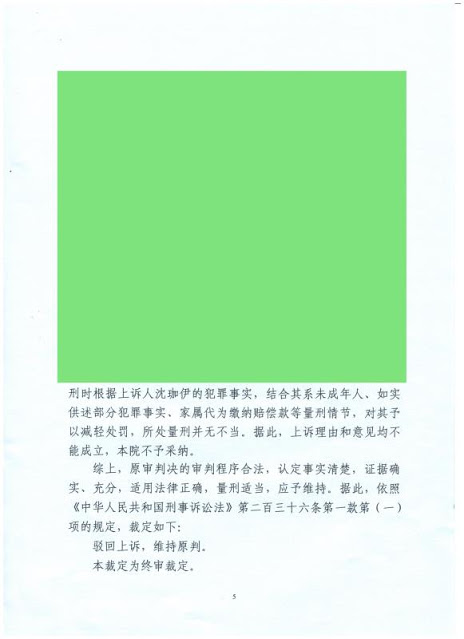 (维权网信息中心报道)2021年1月7日,本网获悉:无锡人权捍卫者沈爱斌17岁女儿遭株连迫害判刑案,二审无锡市中级法院作出“驳回上诉,维持原判”裁定。