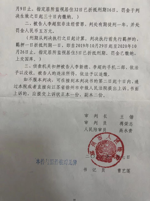 (维权网信息中心报道)2021年1月12日,本网获悉:“中国舆论监督网”创办人李新德被江苏省邳州市法院以“非法经营罪”判刑5年。
