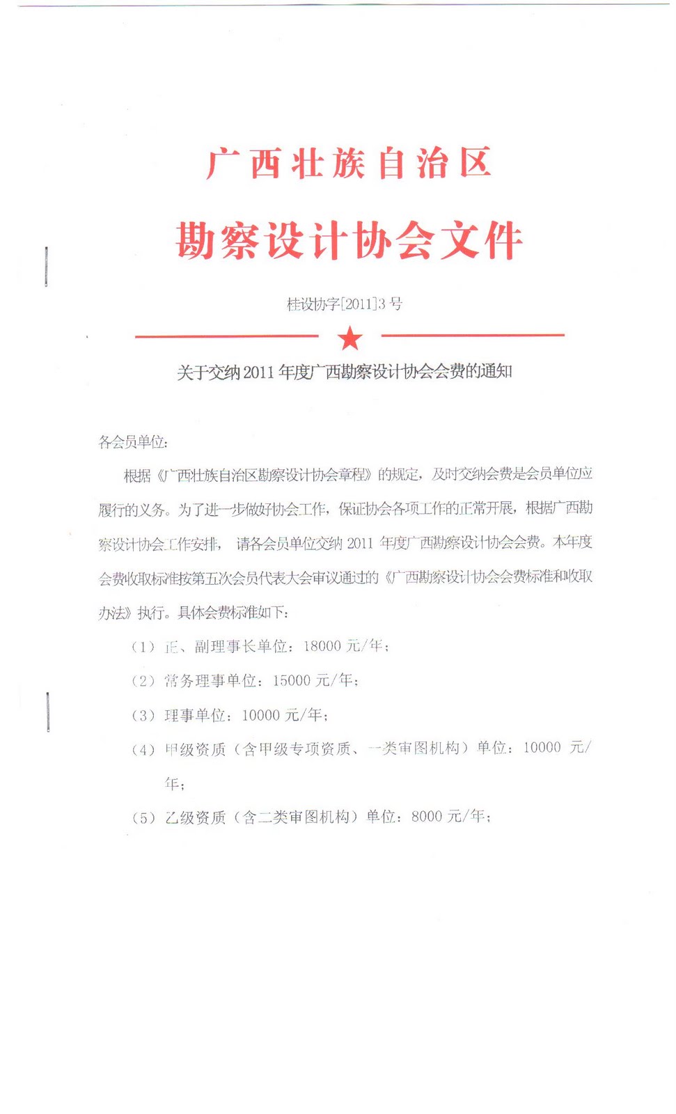 近日,广西壮族自治区的建筑设计公司收到广西勘察设计协会的桂设协字[2011]3号红头文件通知,该文件称:依据《广西壮族自治区勘察设计协会章程》规定……为了进一步做好协会工作,保障协会各项工作的正常开展,要求各协会会员必须在4月30日前向协会交纳乙级资质8000元、甲级资质10000元的会费。
