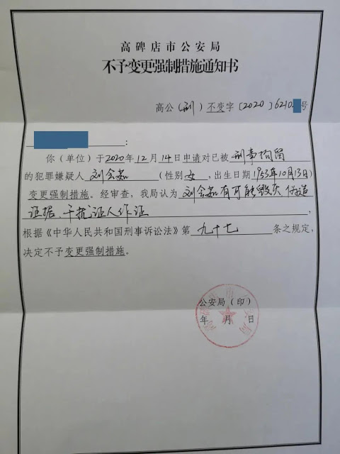 在刘会茹被刑拘后,因她已67岁,患有高血压、糖尿病等多种疾病,需要每天服药,在饮食起居上都需要照料,为此律师曾两次向警方申请“取保候审”。而负责该案侦办的高碑店市公安局在“不予变更强制措施通知书”上说,“ 经审查,我局认为刘会茹有可能毁灭、伪造证据、干扰证人作证。根据《中华人民共和国刑事诉讼法》第九十七条之规定,决定不予变更强制措施。”