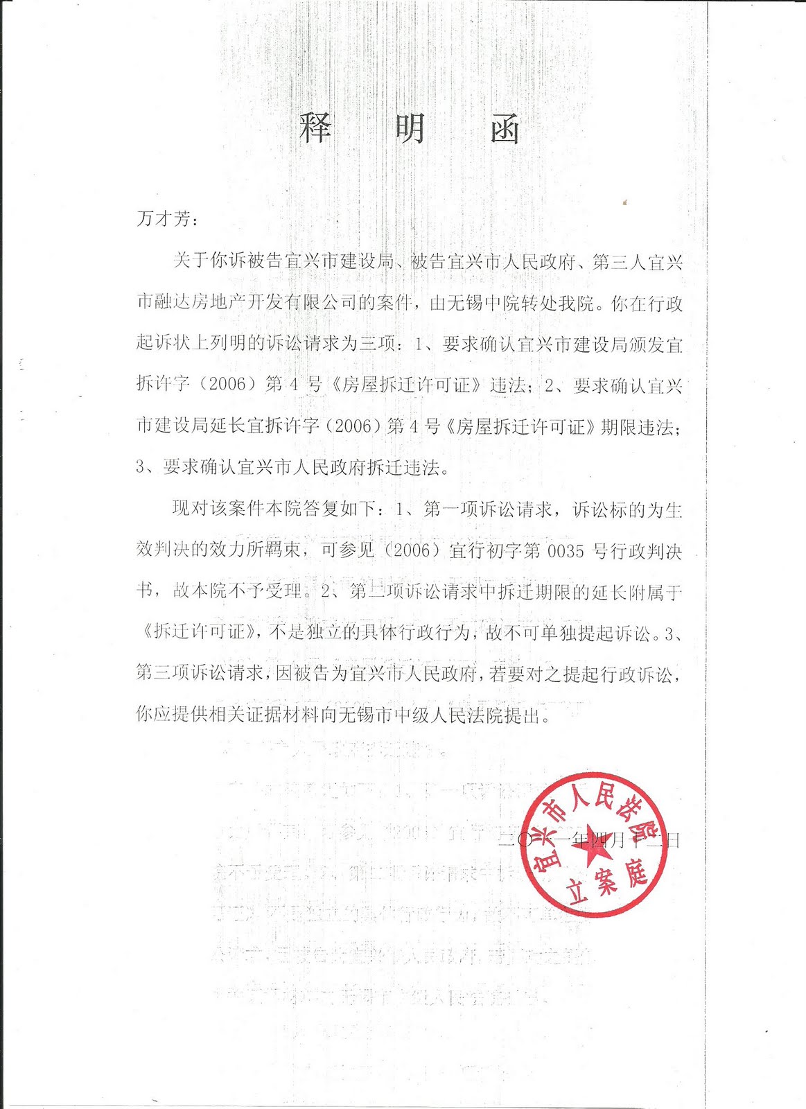 宜兴市建设局为这样一起圈占囤积大宗土地的违法项目发放《房屋拆迁许可证》、并七次作出延期的行政行为毫无疑问属于行政违法行为,宜兴市人民政府在宜兴市建设局的违法行政的基础上,再作出对该宗土地上万才方房屋强制拆迁决定形成了一个违法行政的整体。当万才方以“宜兴市人民政府和宜兴市建设局共同实施违法行政行为”为由起诉到无锡市中级法院后,无锡中院却要求万才方将行政诉讼拆解,告宜兴市人民政府由无锡市中院立案,告宜兴市建设局由宜兴市法院立案。但宜兴市法院却一直拒绝受理,中级法院和基层法院相互推诿,导致法律规定7个工作日内必须受理或裁定不予受理的行政诉讼至今没有着落。