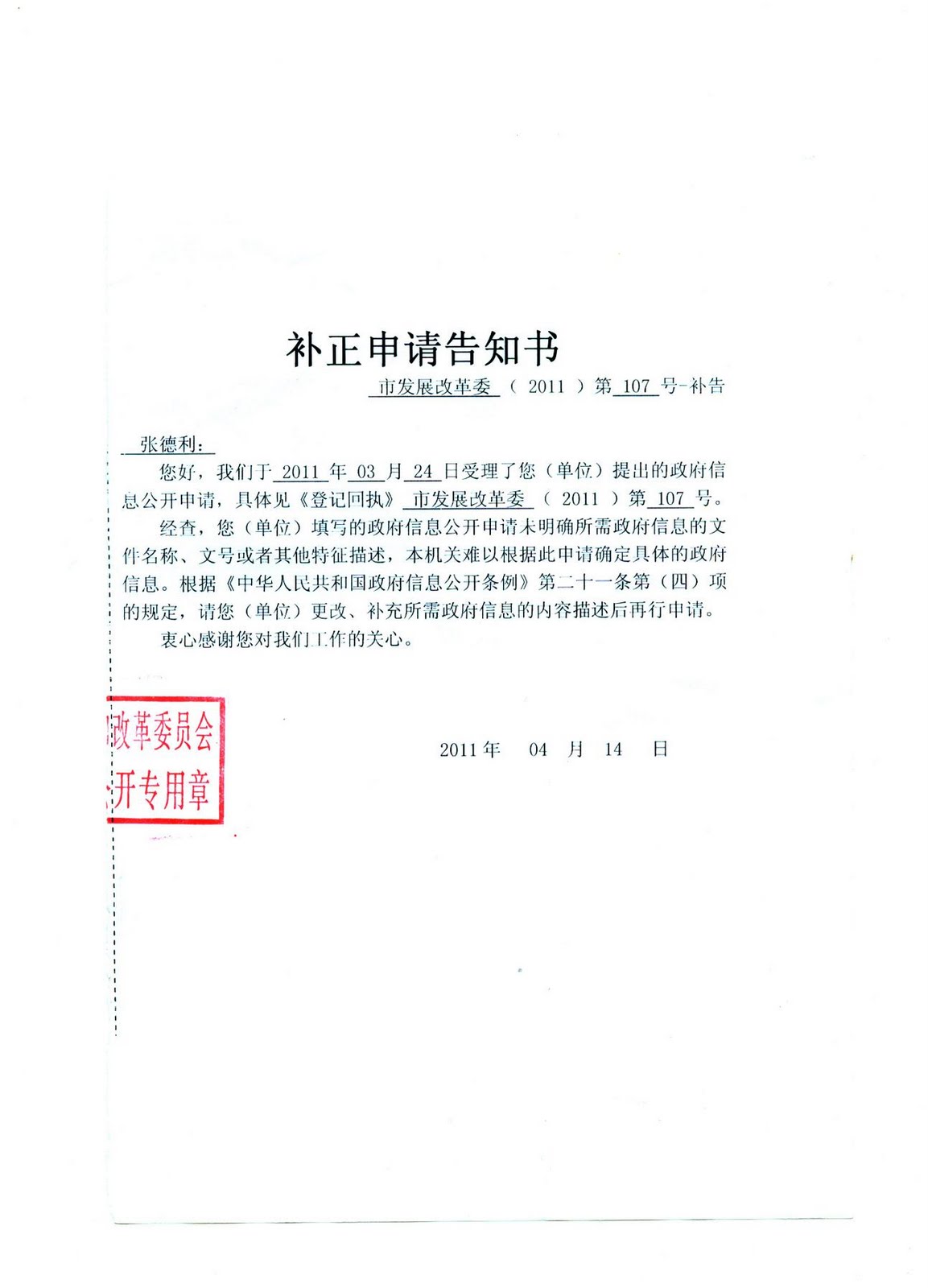 (张淑凤向北京市发改委申请土地承包项目批准文件,结果作为行政主管部门的北京市发改委根本不知道在仁和镇前进村有土地承包项目)