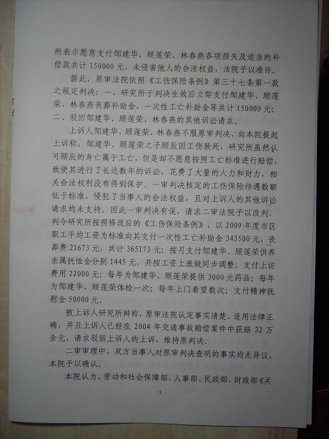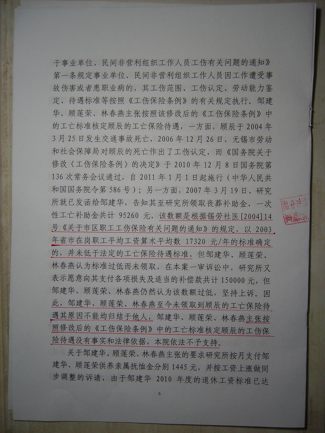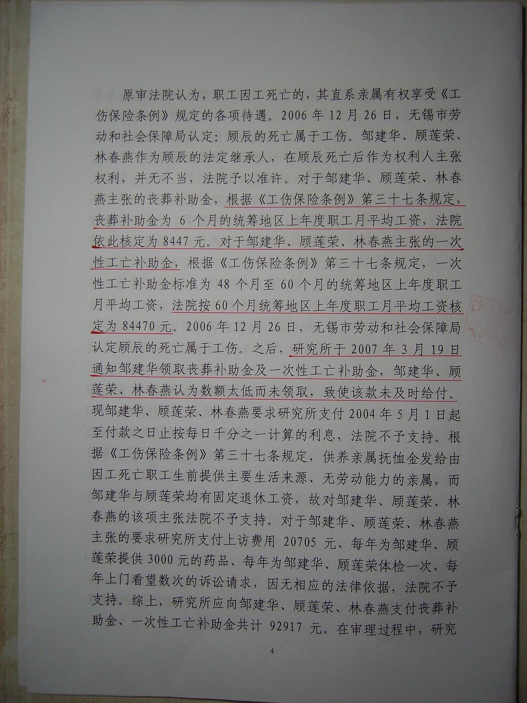 直到2006年12月,我总算得到了儿子的工伤认定。但儿子的工作单位仍然坚持用低于03年(19505元/年)的人均收入17320元/年来计算工亡补偿金。按照无锡市政府的规定:因工死亡职工一次性工亡补偿金标准,市本级统筹区确定为60个月的市区上一年度职工月平均工资;最高人民检察院又规定以一审法庭辩论终结时的上一统计年度来确定有关的赔偿标准,本案的一审辩论终结是2010年6月,则上一统计年度应当是2009(43346元/年)统计年度。
