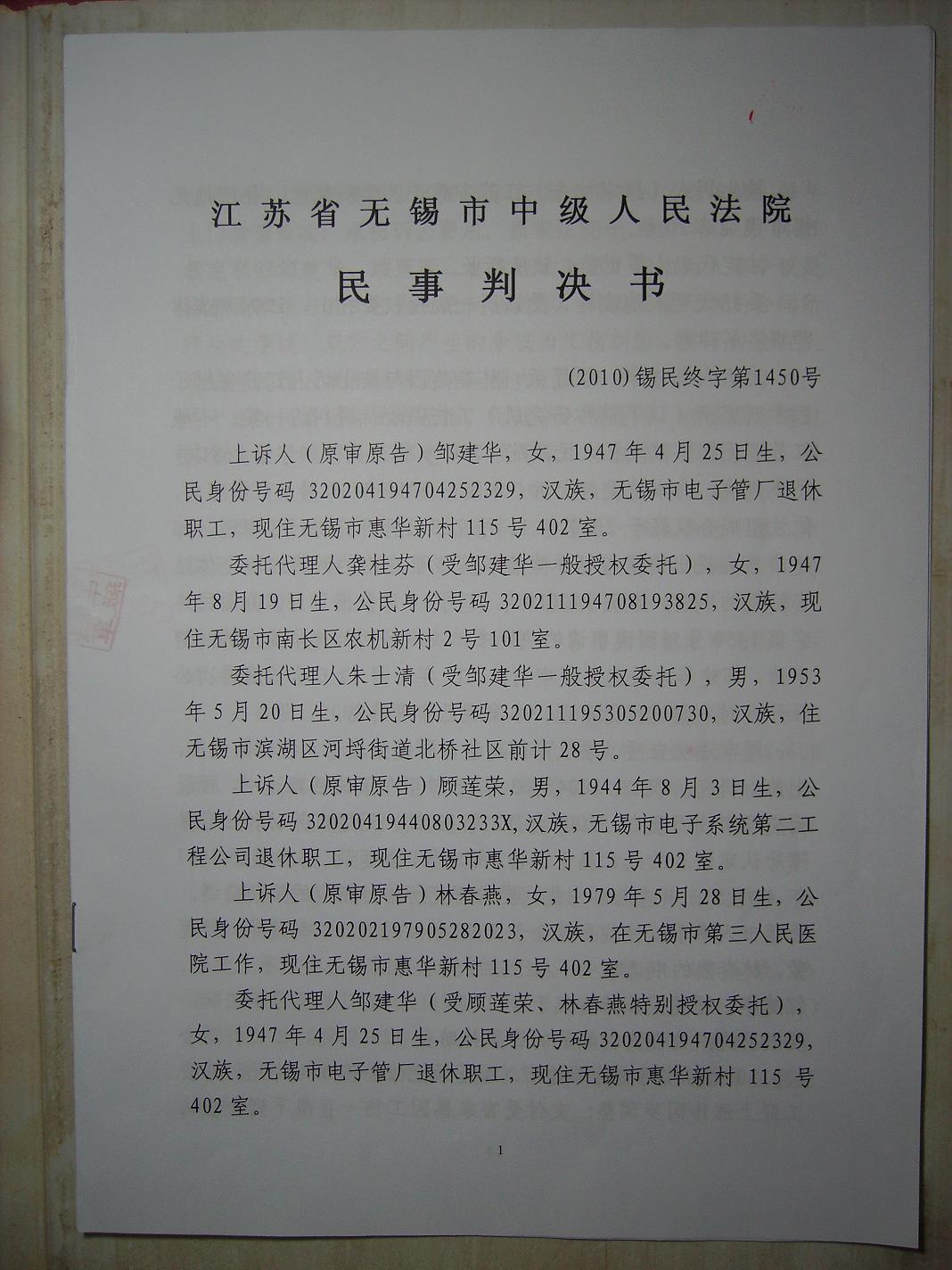 【提示:江苏无锡的退休女工程师邹建华,在追讨独生子的因工死亡补偿金的7年中,遭遇了下到地方人事局、劳动局,上到国家人事部、劳动部的行政不作为和乱作为;在司法诉讼中,无锡市滨湖区法院和无锡市中级法院更是罔顾法律条文,一次次作出故意的枉法裁判。在真正的市场经济国家,有独立的工会组织,劳工权益无疑会得到优先的保障,一旦诉诸司法,侵害劳工权益的用人单位必将受到惩罚性的裁判。而在社会主义特色市场经济,一旦出现因工伤亡,如邹建华、顾莲荣这样的知识分子家庭都难以为工亡的儿子讨回公道,更何况生活在社会底层的平民百姓?邹建华表示,为了使法律在权贵州阶层有所信奉和遵守,自己将继续申诉、依法维权。】