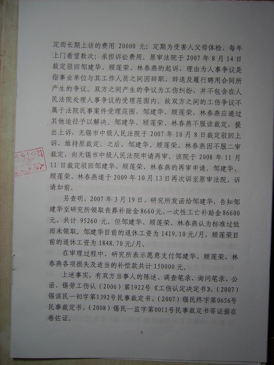 我叫邹建华,今年65岁,江苏无锡人。我的独生子于04年3月因工死亡,虽然由温家宝总理签发的《工伤保险条例》早已在04年1月1日就已经施行,且规定中国境内的所有职工都能享受,但只因我儿子的工作单位江苏省原子医学研究所是事业单位,所以,早已不管工伤事故的人事局和只管企业工伤的劳动保障局都不给我们作工伤认定,我儿子的工作单位趁机在无锡人事局陶宇震的授意下只愿给付两万元的工亡补偿金和6百元的丧葬费,多次协商无果后,我被迫走上了上访之路。