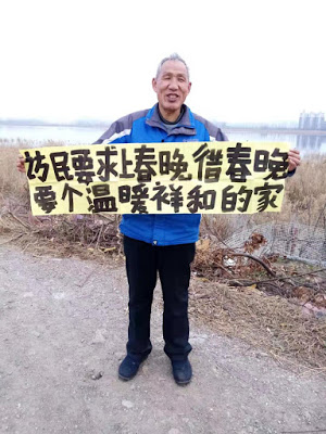 (维权网信息中心报道)2021年2月10日,本网获悉:今天是农历小年夜,憋屈了一年又一年的江苏徐州访民吴继新,举牌希望上春晚,吼一声请官员们公开财产!之所以要求官员公开财产,是为了他这样的访民都能够有一个温暖、祥和、固定的家。