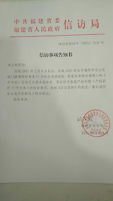 (维权网信息中心报道)2021年3月8日,本网获悉:因房屋遭强拆而上访维权13年的福州市仓山区冤民刘玉钗,今天在两个维稳人员的“陪同”下,赶到福建省信访局找副局长林本正,要求其兑现春节前的承诺,解决其合理诉求,结果林副局长避而不见,由工作人员给了一张推诿的信访告知。