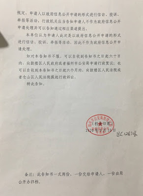 2021年3月10日上午8点,福州维权人士江智安因福州市公安局鼓楼分局不履行政府信息公开法定职责,依据信息公开告知书前往仓山法院立案。疫情原因,各种操作才能进入立案大厅,仓山法院却告知要去晋安法院起诉。