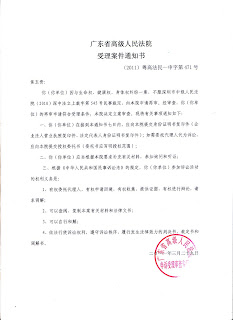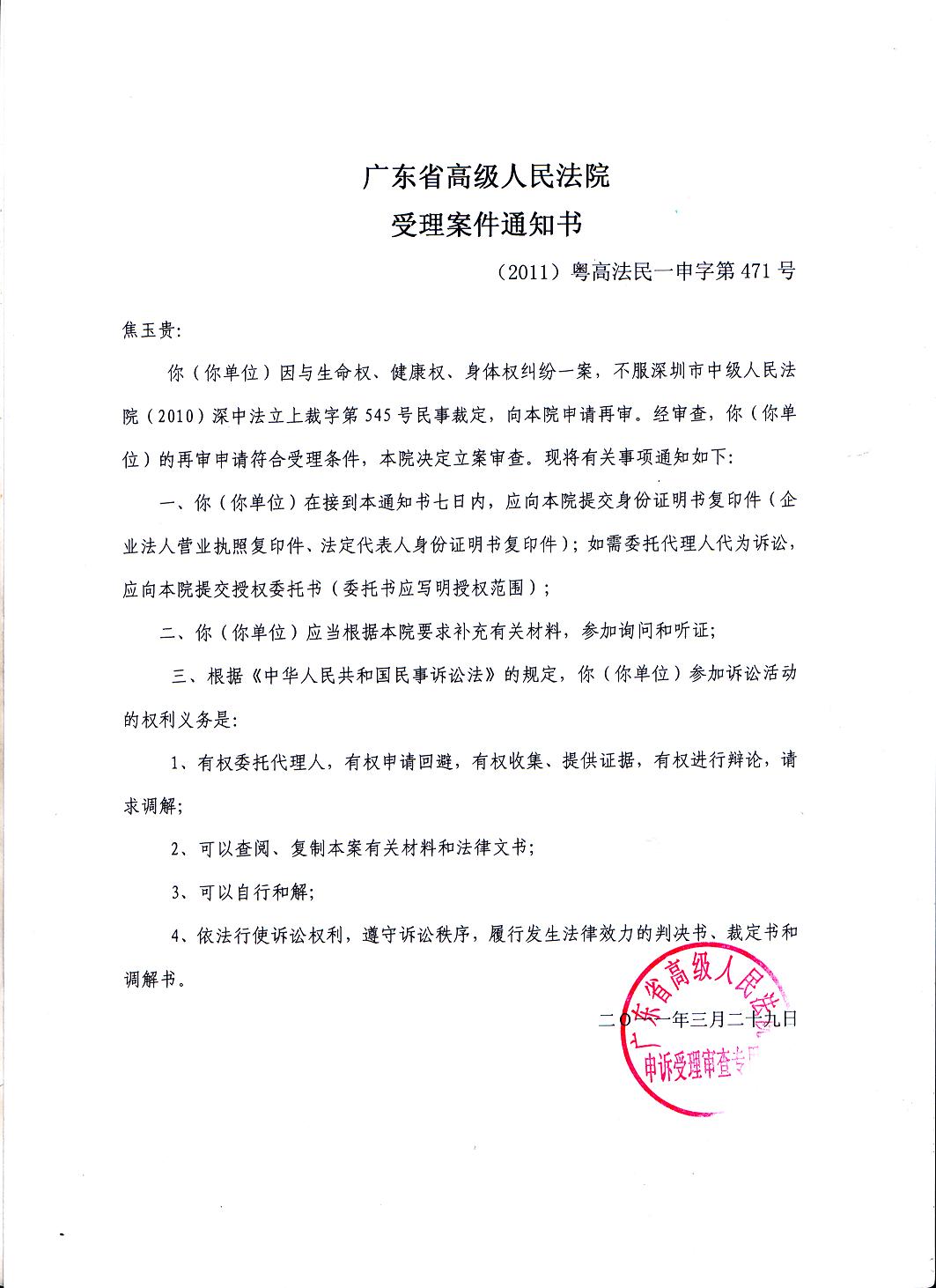 因整容遭遇山寨整容师而造成毁容结果的、现居住在深圳的原国家二级演员焦玉贵,今天收到广东省高院邮寄(2011)粤高法民—中字第471号的案件再审受理通知书,这是焦玉贵不服深圳市中级人民法院(2010)深中法立上栽字第545号民事裁定、于2011年2月19日通过媒体向法院发出严正《警告》后的收获,不是愚人节的玩笑。