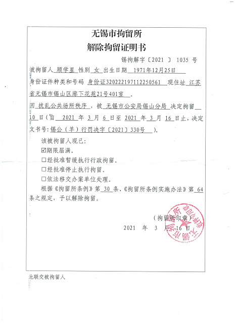 (维权网信息中心报道)2021年3月17日,本网获悉:无锡市锡山区访民顾学星和沈琴芬因进京上访被行政拘留十日获释。