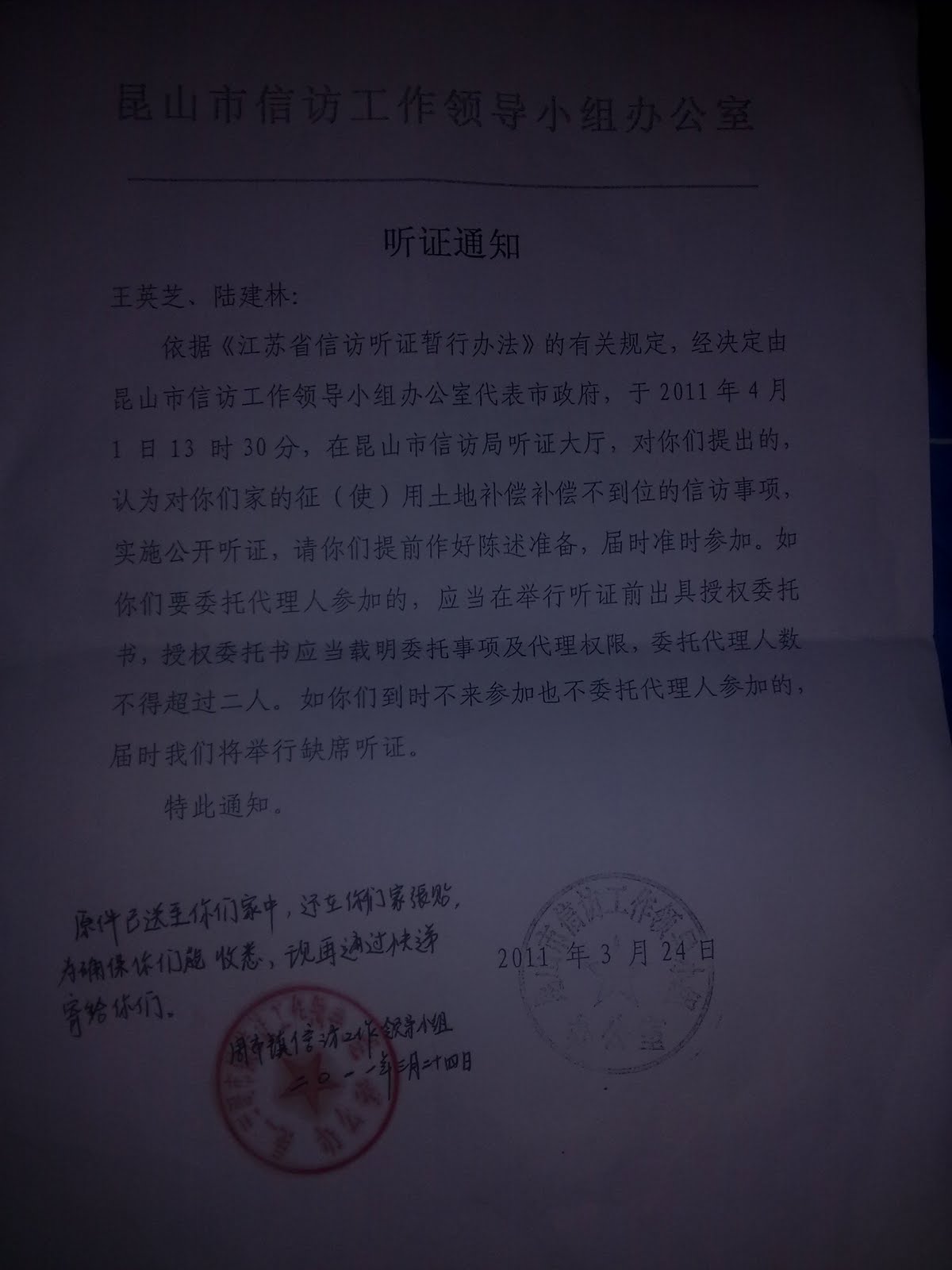 昨天,刚从东北娘家回来的江苏省昆山市周市镇中乐村村民王英芝看到大门口贴有一张署名昆山市信访局的通知,该通知书告知王英芝,昆山市信访局在今天下午13.30分在信访工作小组办公室就其上访控告昆山市政府非法征地进行公开听证,希望其准时参加。